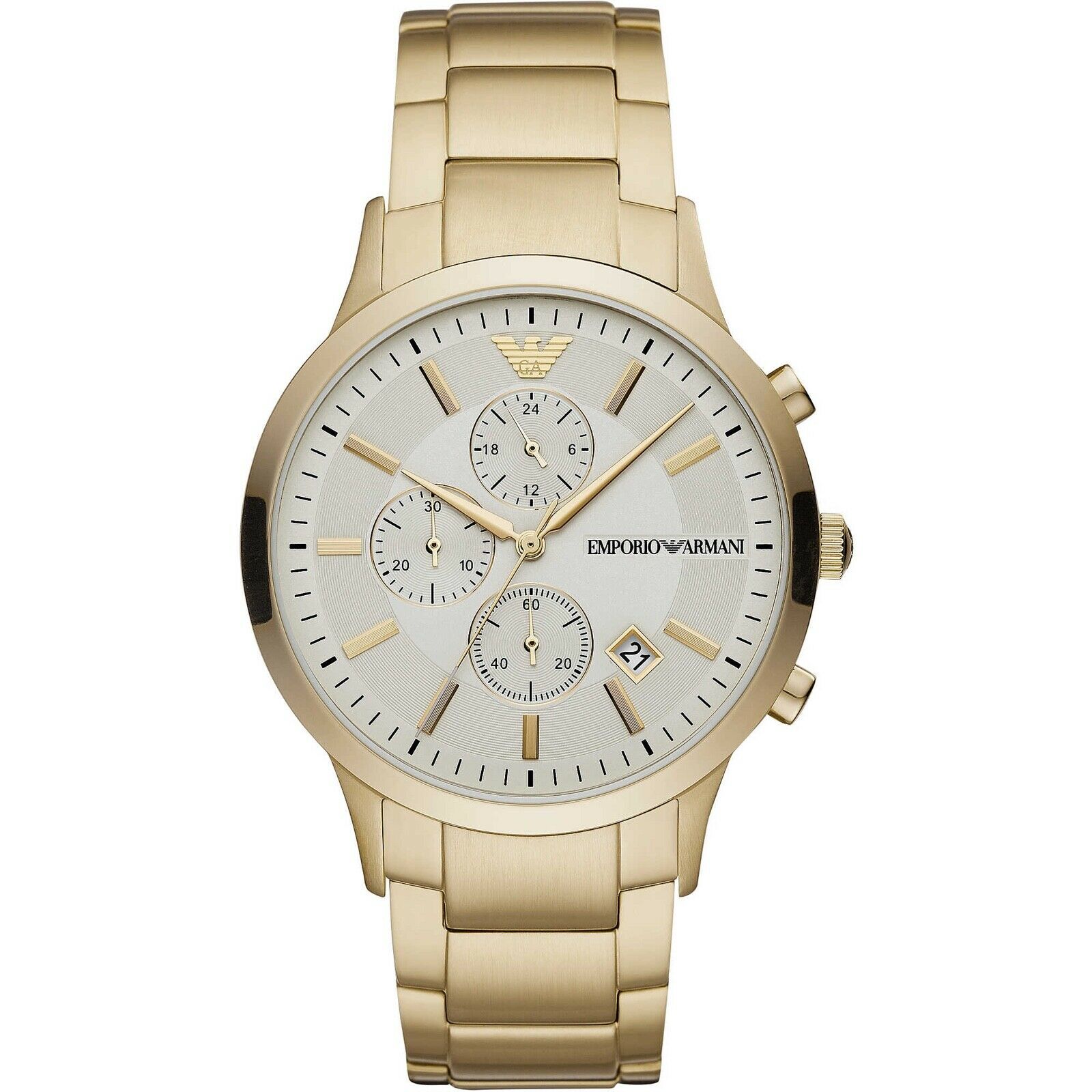 Cream dial enhanced by gold-tone hands. Gold-tone stainless steel case with a gold-tone stainless steel band. Quartz movement. 50 meters / 165 feet water resistance. Fixed bezel. Scratch Resistant Mineral crystal. Solid caseback. Deployment clasp. Pull / Push crown. Case size 43 mm. Band 22 mm x long. Emporio Armani AR11332 Watch.
