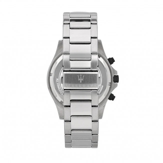 MASERATI watch SFIDA - R8873640003 - Case Material & Finish: Stainless Steel, Case width: 44mm, Strap Material: Metal , Strap Colour: Silver, Dial Colour: White, Water resistant: 10ATM, Crystal: Mineral crystal, Material: Stainless Steel, Case thickness: 11.40, Gender: Male, Buckle: Box buckle with pushers, Guarantee: Maserati 2 years guarantee, Packaging: Maserati original packaging,