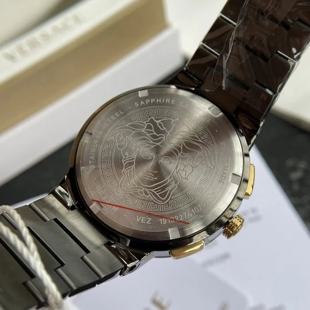 The attractive unisex watch conveys an urban and sporty look at the same time with its transparency and color. This Ronda 5021D Swiss watch homes a striking 44 mm dial with duo chronographs and slim hands powered by reliable quartz movement with date at 6h. Absolutely and exquisitely iconic, the design elements include the metal loop on the strap that recalls the Greek key, a Medusa at 12h and an internal Greek key that can be seen from the curvature of the inner dial ring.