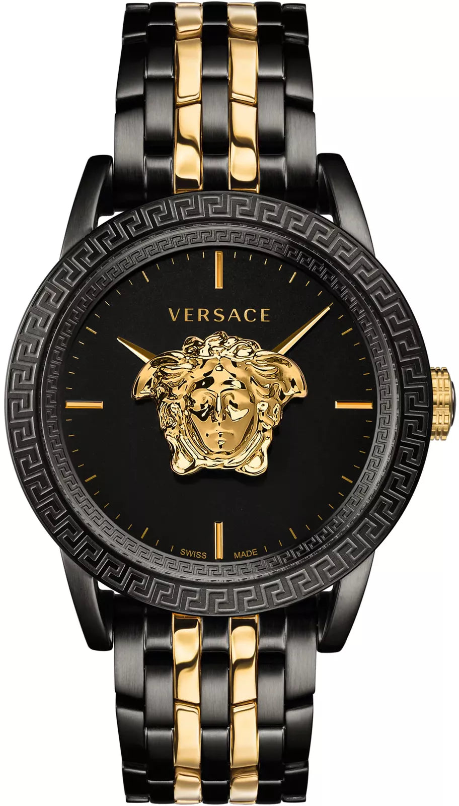 Case: 43mm x 13mm Black Plated Double Construction 316L Stainless Steel Case - Greca Engraved Bezel - Push-Pull Crown - Domed Anti-Reflective Sapphire Crystal - Solid Stainless Steel Caseback with Versace Engraving.